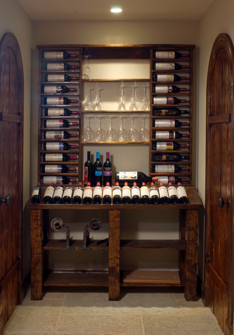 WunderWoods stained hand hewn white pine wine cellar Mouton Rothschild display